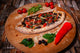 Mergi la magazinblat, sos pizza, mozzarela, cubulete carne vita, rosii cherry, ceapa, ardei, patrunjel